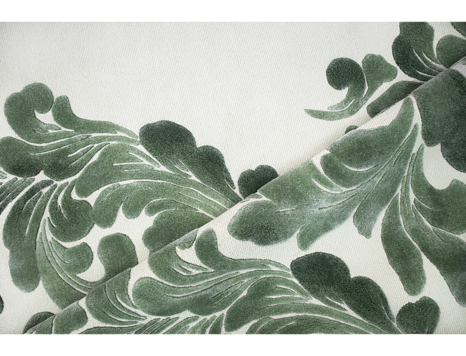 Unlike the full-pattern version, the design of this rug, is intentionally placed only on part of the surface, creating a refined balance between ornamental richness and pure minimalism. The soft water-green tone enhances this asymmetry, turning the rug into a subtle yet artistic statement piece. Eau de Jade, is Superior Handtufted in Loop Bamboo Silk and Bamboo Silk Relief. This rug, is ideal for modern interiors, it embodies both French heritage and a contemporary sense of restraint.