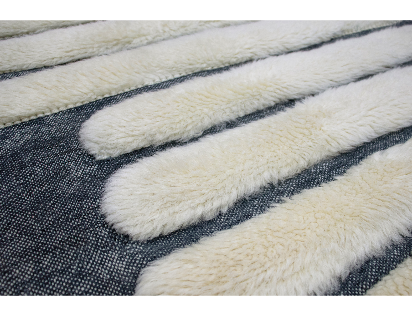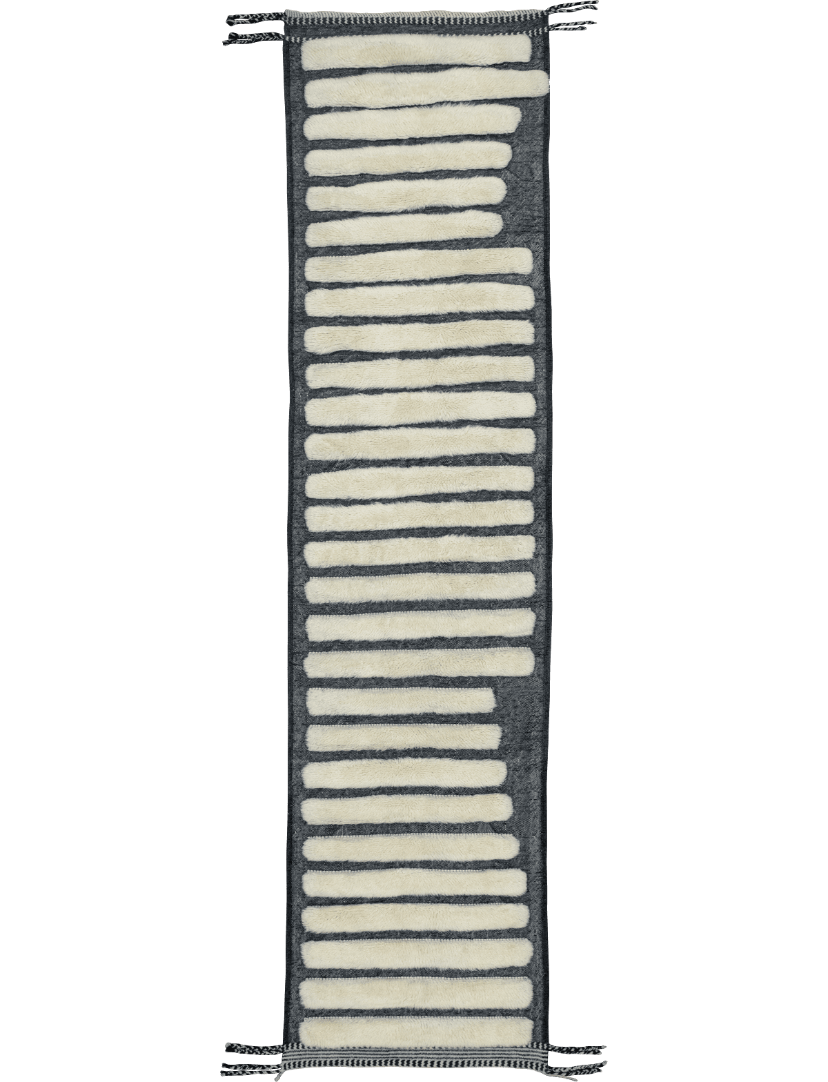 Its design features a rhythmic sequence of elongated ivory shapes set against a deep grey ground, creating a striking contrast and a bold linear composition. Tan-Tan is Handknotted in Wool on Wool. If you need a size or shape not listed here, you are welcome to place a bespoke order.