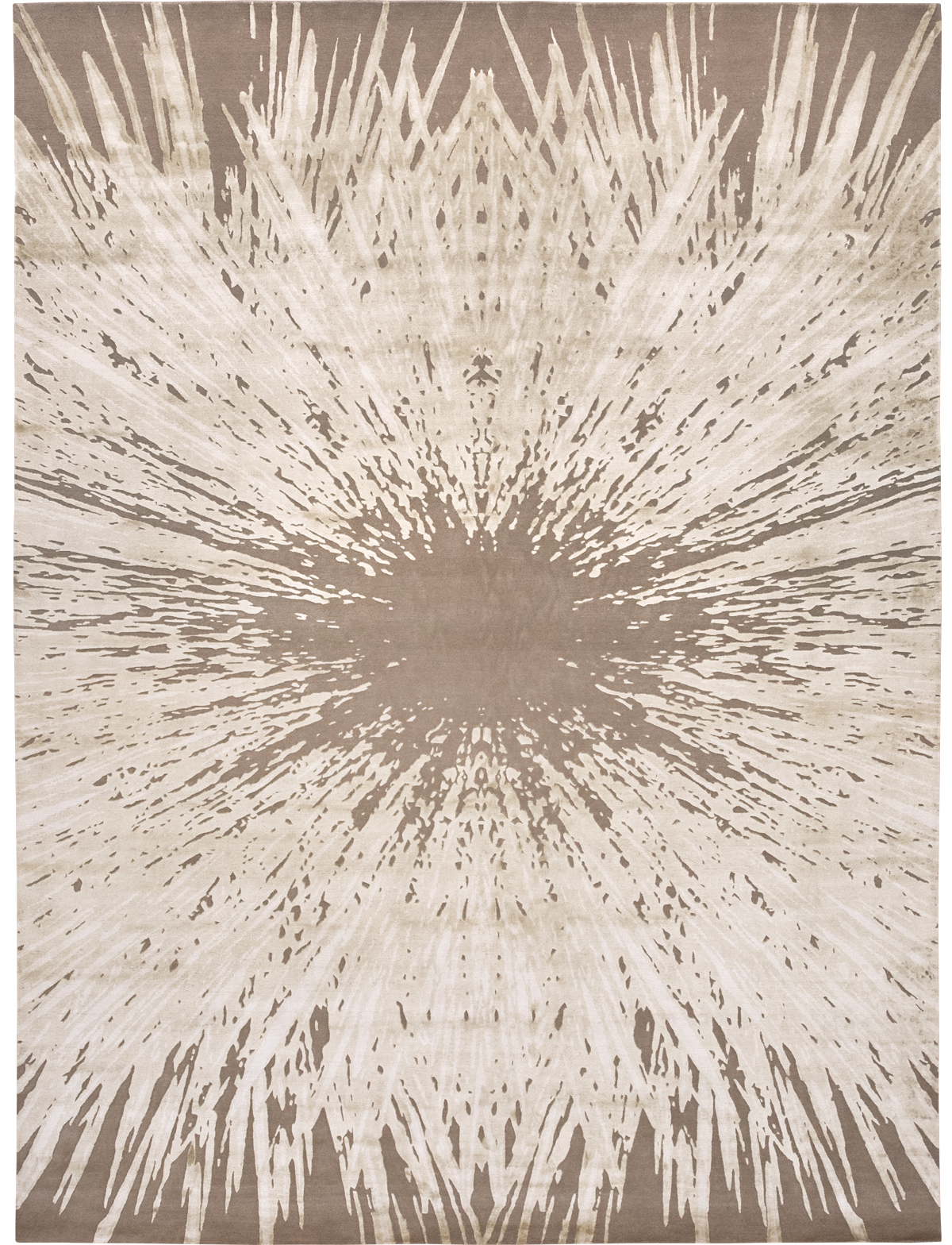 Radiance is part of the Noor Collection by Sahrai. This rug is distinguished by a bold, radiant design that evokes the energy of an abstract burst unfolding across the surface. Its composition expands outward from a central point in elongated, irregular forms, creating a powerful sense of movement and symmetry. Radiance is Finely Handknotted in New Zealand Wool and Natural Silk Relief.
