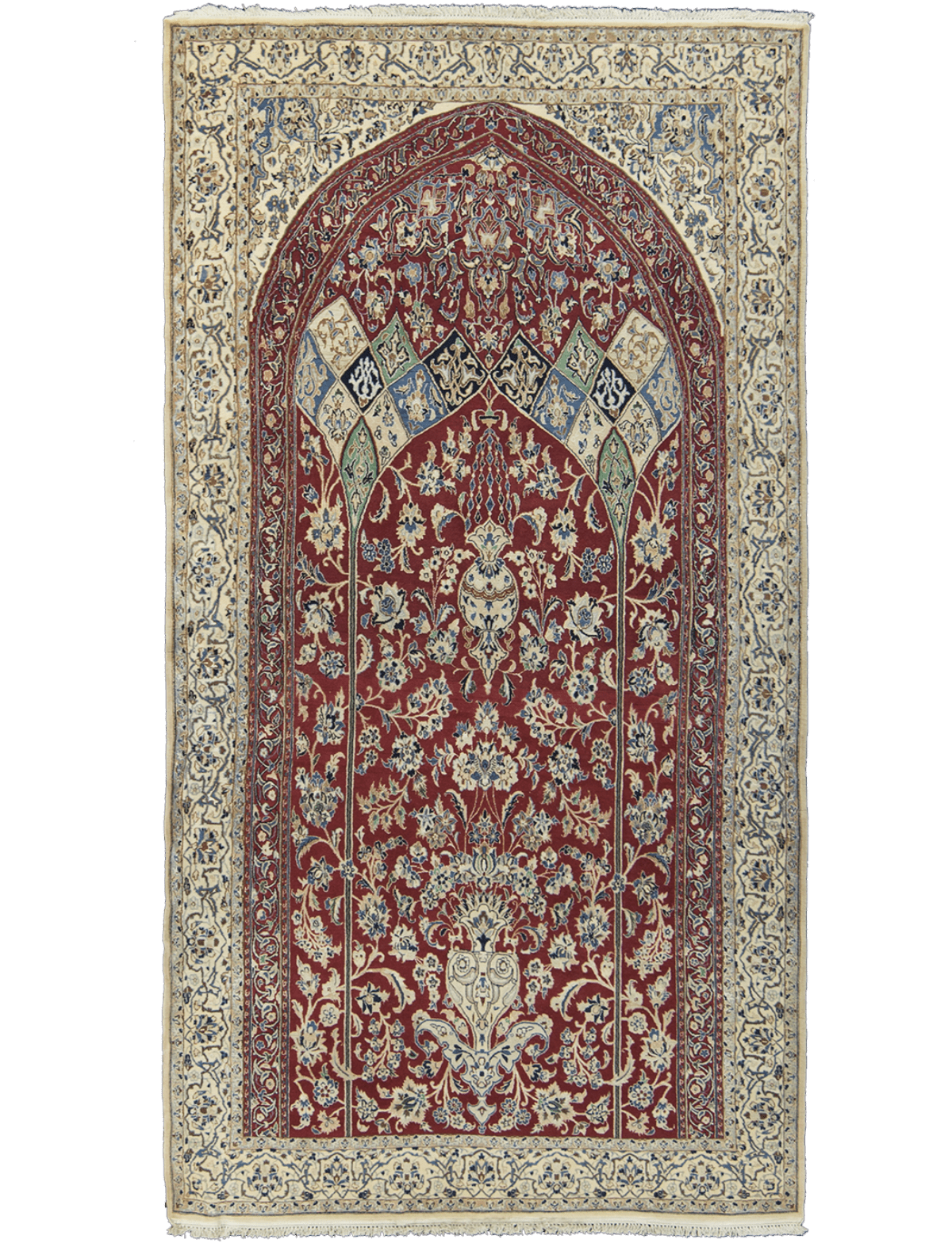 Nafisseh is part of the Parsa Collection of unique Persian rugs by Sahrai. This rug features a cross section of a dome displaying ornate floral designs and defined by a contrasting pattern encompassing other floral ornaments. This beautiful piece is one of a kind and is finely hand-knotted in Wool and Silk and is available in: