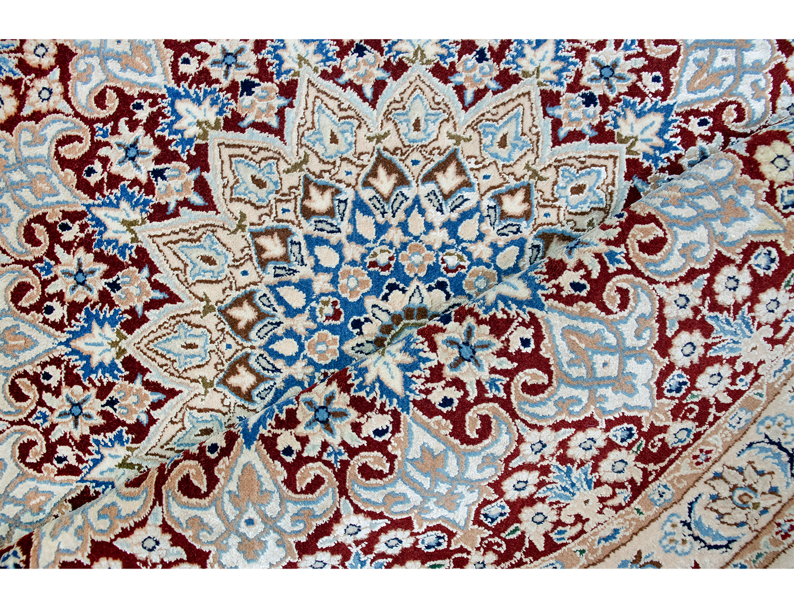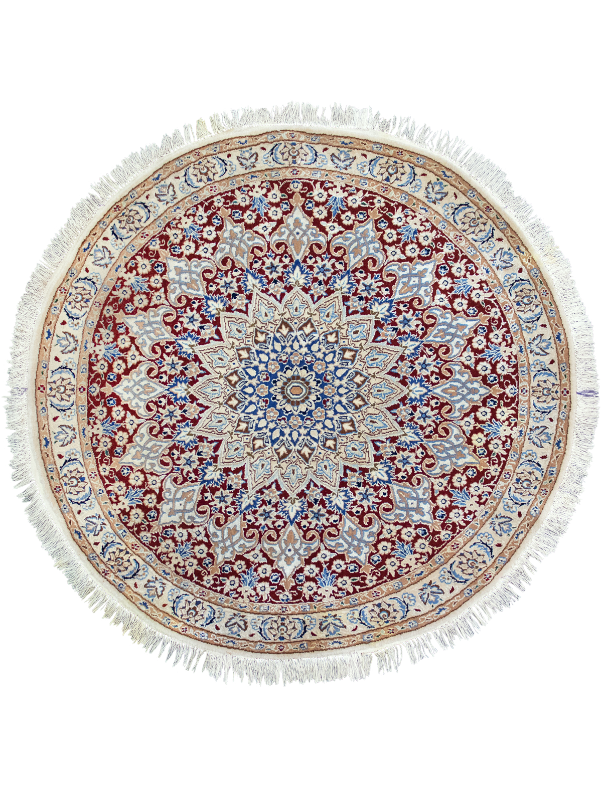 This Nain rug is part of the Parsa Collection by Sahrai. This unique rug is distinguished by its elegant circular composition, centered by a refined medallion and enriched by intricate floral motifs. This Nain rug is Finely Handknotted in Wool and Silk on Silk in the following dimension: